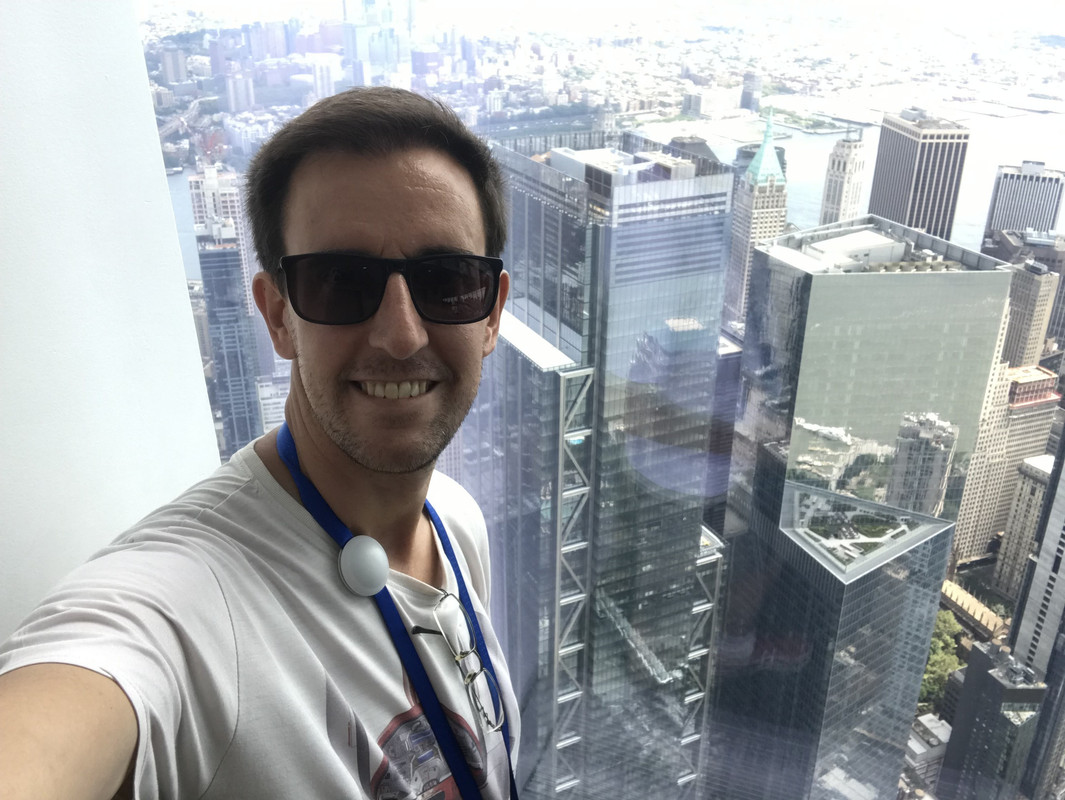 Lo malo de tomarse un selfie a 400 metros de altura es doble. Primero, la gran cantidad de gente que hay en el One World Trade Center. Segundo, la escasa luz que hay dentro del observatorio y la mucha que hay fuera. Es difícil conseguir que se vea la cara con claridad. Pero bueno, al final fui capaz de hacerlo y sin nadie alrededor. Lo que se ve a mi espalda son los otros edificios que forman parte del World Trade Center. Justo debajo estaban los memoriales a las víctimas del 11S.